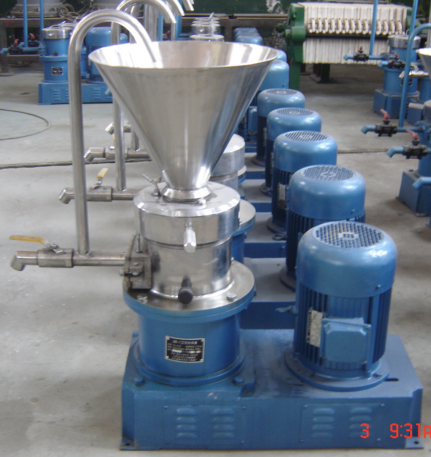 工作原理:膠體磨是由電動機通過皮帶傳動帶動轉齒(或稱為轉子)與相配的定齒(或稱為定子)作相對的高速旋轉,其中一個高速旋轉,另一個靜止,被加工物料通過本身的重量或外部壓力(可由泵產生)加壓產生向下的螺旋沖擊力,透過定、轉齒之間的間隙(間隙可調)時受到強大的剪切力、摩擦力、高頻振動、高速旋渦等物理作用,使物料被有效地乳化、分散、均質和粉碎,達到物料超細粉碎及乳化的效果。