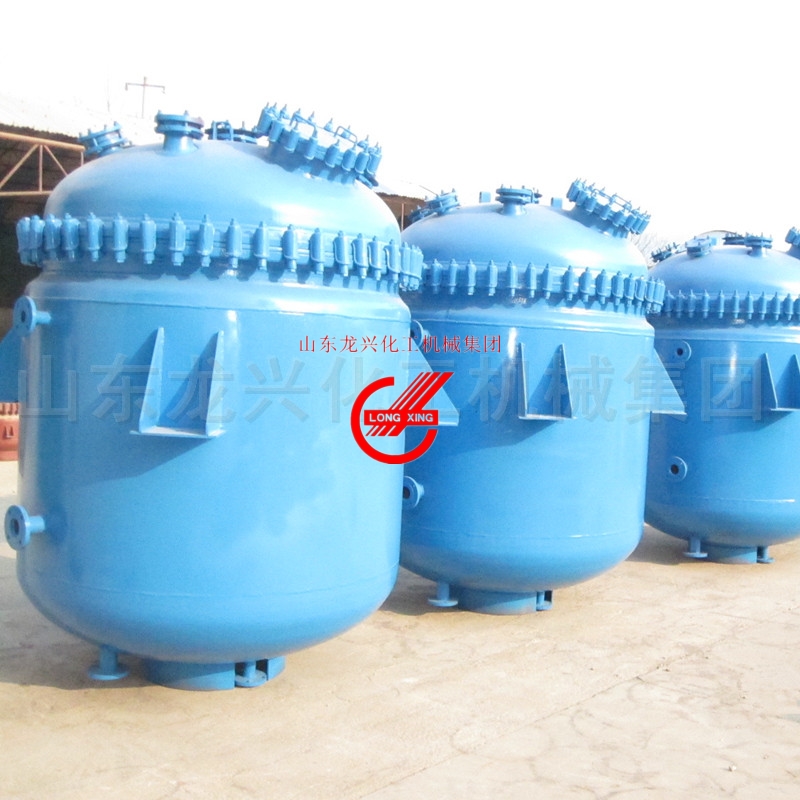 搪瓷反應釜由鍋體、鍋蓋、攪拌器、加熱夾套、支承及傳動裝置、軸封裝置等組成。 鍋體與鍋蓋由法蘭密封聯接,鍋體下部有放料孔,鍋內有攪拌器,鍋蓋上開進料、攪拌觀察、測溫測壓、蒸汽引出分餾、安全放空等工藝管孔。鍋蓋上部焊接支架上,裝置減速機與電機,由傳動軸驅動鍋內攪拌器,軸封裝置在鍋蓋頂部。加熱夾套上開有進、排油(汽)測溫,放空蒸汽閥門、電熱棒等接管孔。